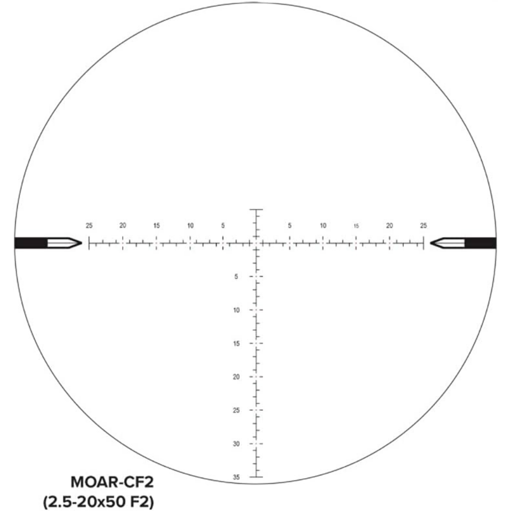 - MOAR-CF2 RETICLE - The new MOAR-CF2 reticle is calibrated at 20x and provides users with an open center with a dot and intuitive numbering of subtensions for a clear view of the target and fast holds anywhere in the reticle