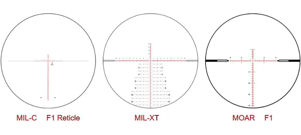 Reticle options vary by model. For example, the NX8 2.5-20x50 F1 lists options including MOAR F1, MIL-C F1, MIL-XT, MOA-XT, and Horus TREMOR3.