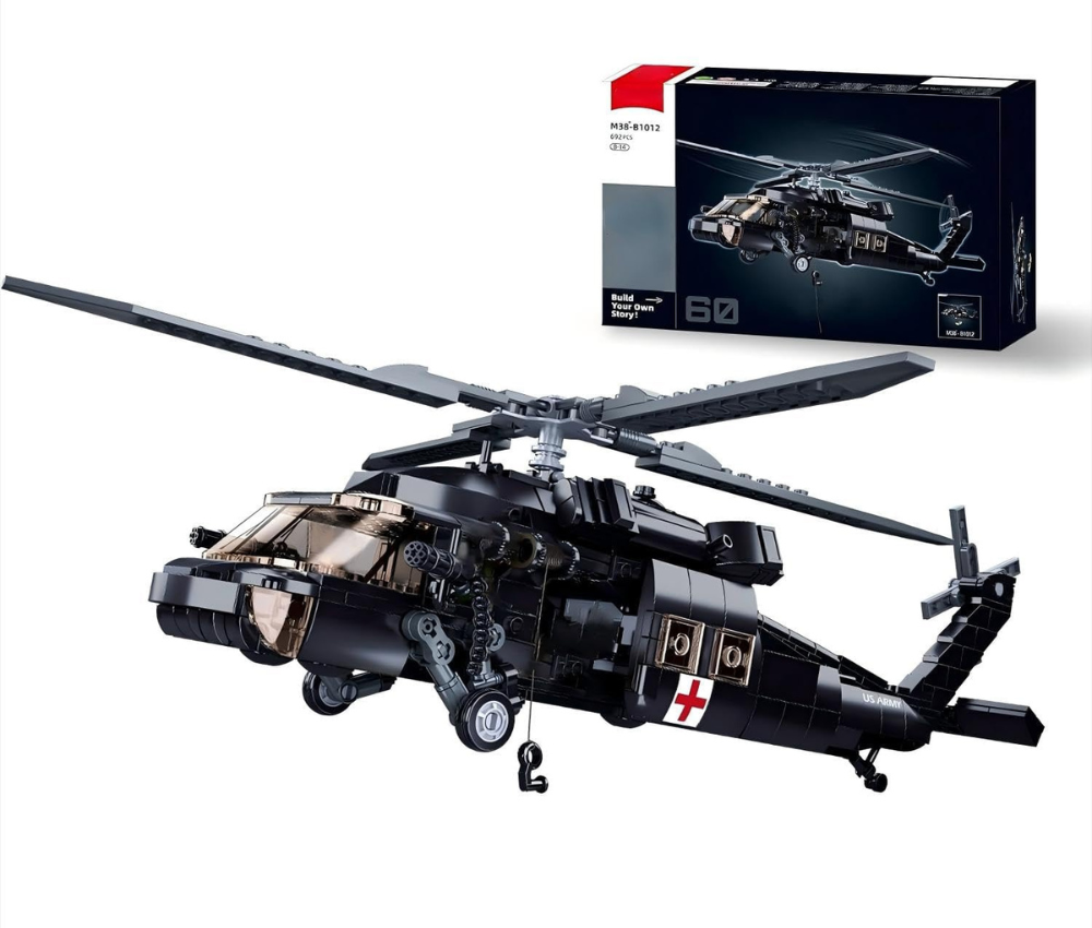- UH-60 Helicopter Building Set: The UH-60 Black Hawk Rescue Helicopter Model boasts a highly detailed and authentic design, perfectly capturing the iconic look of this legendary WW2 military helicopter. Including four soldier minifigures and various accessory equipment, crafted with precision, every aspect—from its sleek fuselage to the intricate rotor blades—mirrors the grandeur of the original, making it an absolute must-have for both military enthusiasts and model collectors alike.
