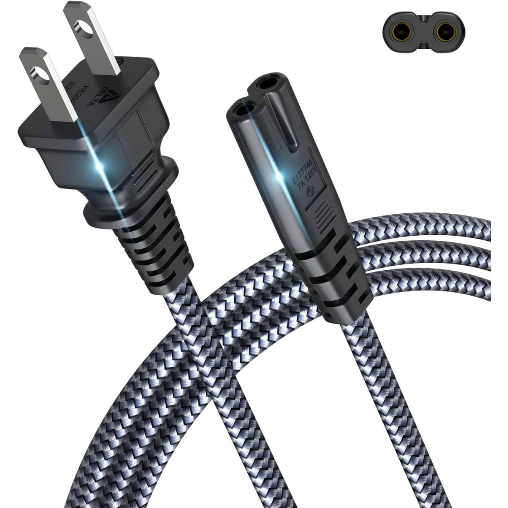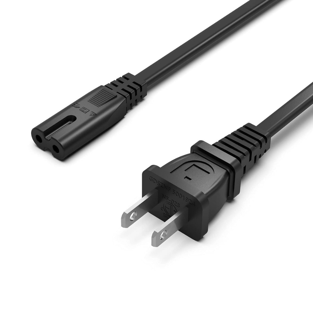 - The AC power cable is compatible with PS game consoles, HDTVs, LED lights, speakers, monitors, printers, DV cameras, and laptop power supplies. It's universally compatible and works with devices with 2-prong AC shroud power connectors. Transmitting constant current and voltage, steady and long-lasting performance, no flicker, and machine heat