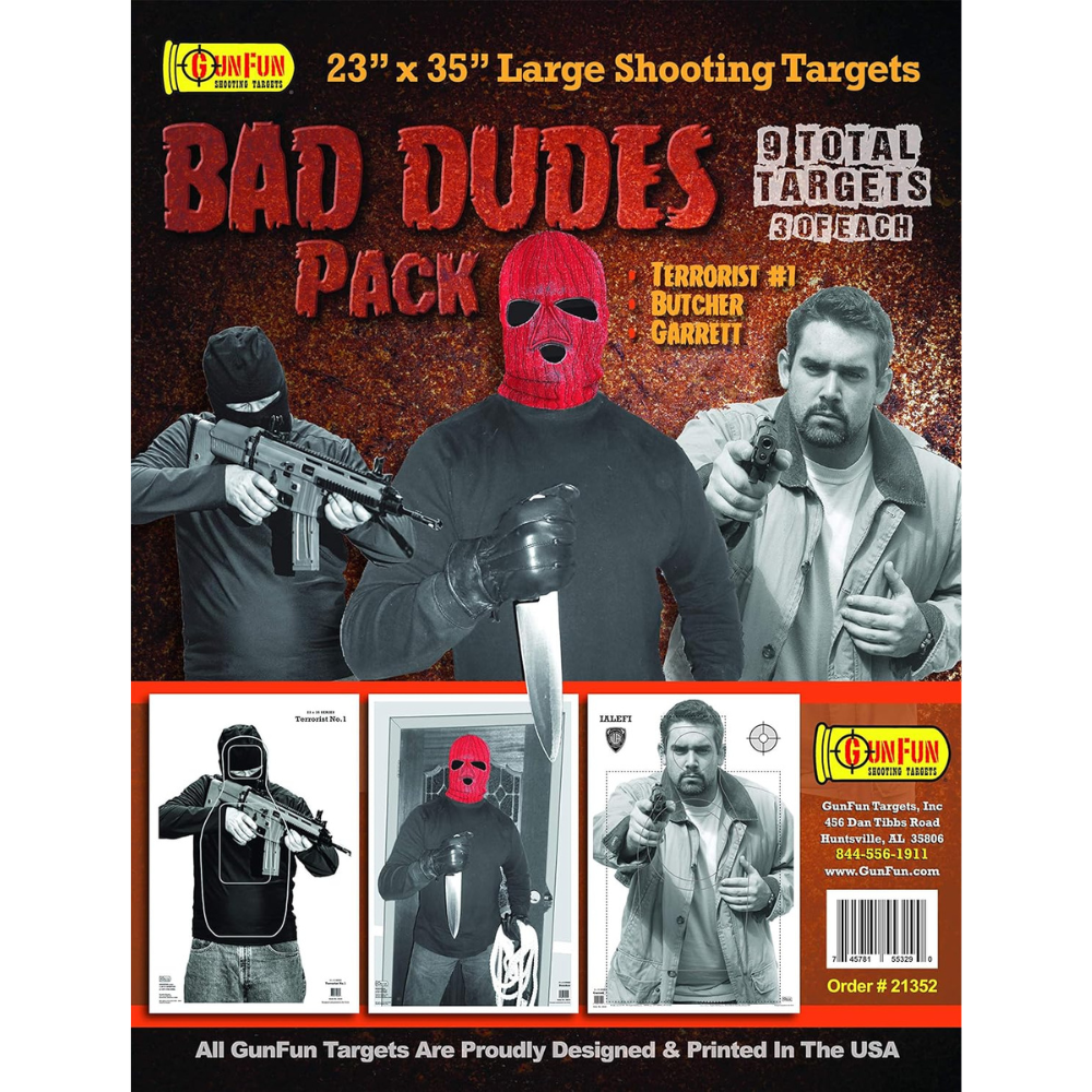 Enhance your shooting practice with our 21352 - 23" x 35" GunFun Targets, Inc. Bad Dude's 9-pack. This premium pack includes three of each popular targets: "Terrorist No. 1", "Butcher", and "Garrett", designed to improve your accuracy and shooting skills. Ideal for both beginners and experienced shooters, our high-quality, realistic targets are perfect for anyone looking to up their game at the shooting range.