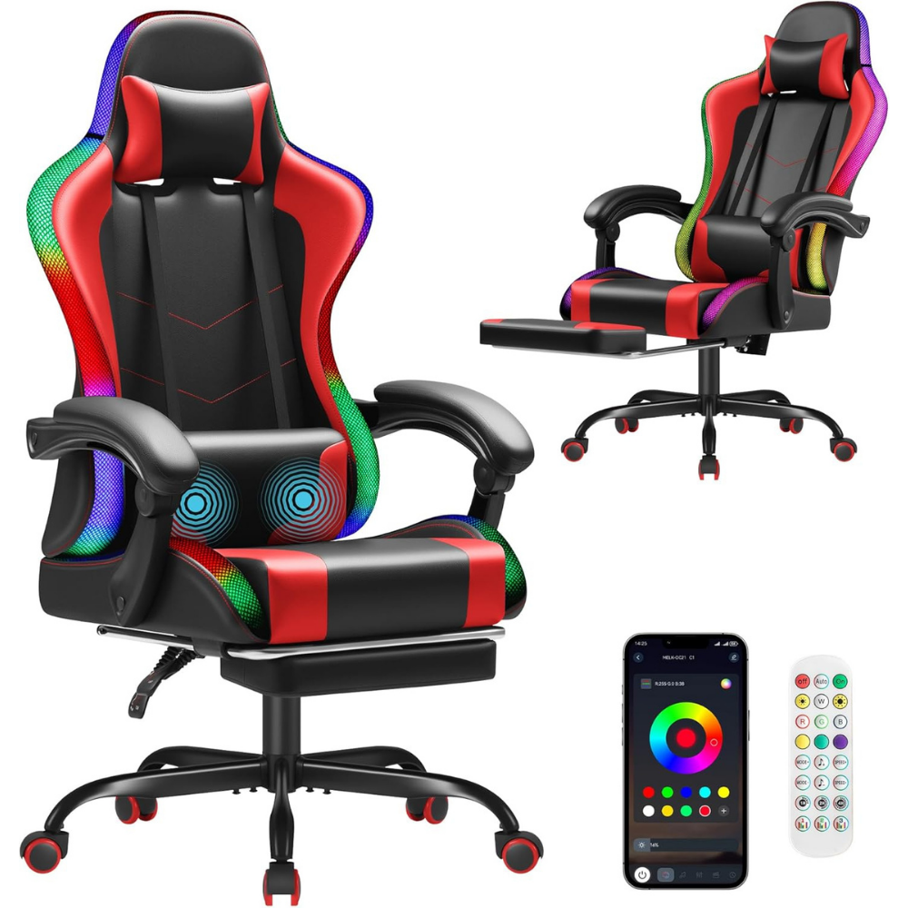 S Racing Gaming Chair, Video Game Chair with Footrest and Massage Lumbar Support, Ergonomic Computer Chair Height Adjustable with Swivel Seat and Headrest (RGB Red)