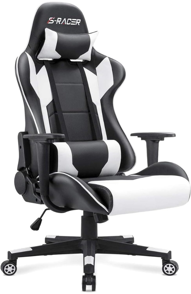 This versatility makes it an easy recommendation for affiliate readers who want one chair for both work-from-home and gaming use. The S Racer is a racing gaming chair with a racing-style, high-back design and PU leather upholstery, and is noted for its ergonomic support for the shoulders, head, and neck.