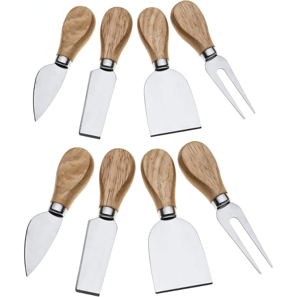 - 8-Pieces Set Includes 2 Semi Heart knives for Spreading Cheese, 4 Rectangular Shapes for Slicing and Spreading, and 2 Prong Fork for Serving. Stainless steel blades with polished wood handles.