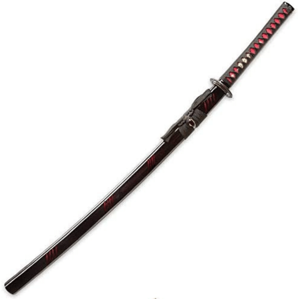- 40 3/4” overall katana fits like a glove in a black lacquered wooden scabbard with matching cord-wrap accents