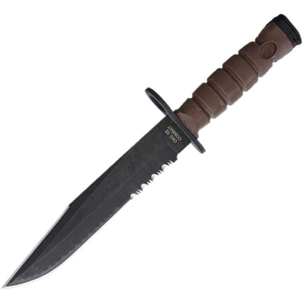 The OKC3S Marine Bay features an 8-inch. 1095 carbon steel fixed partially serrated blade with a zinc phosphate coating and brown modified Kraton handle. This knife has an overall length of 13 inches.