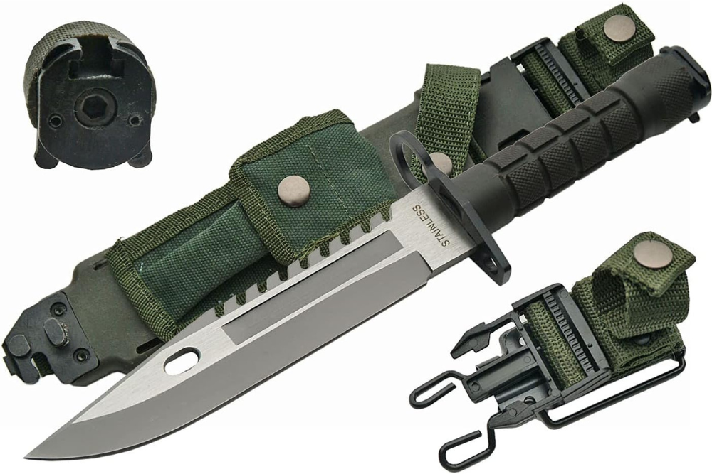 The M9 bayonet and scabbard is one such example of what OTC's quality standards entail, it comes with an OD Green handle and a black 7-inch plain edge blade made from heavy steel weighing 16 ounces total blunt or sharp edges can cut through just about anything we put between ourselves and our tasks at hand.