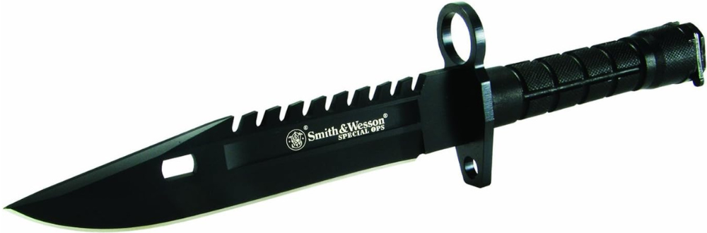 The Smith & Wesson Special Ops M-9 Bayonet is a fully loaded weapon with a blade made from black powder and a textured nylon handle. It has deep grooves that run along its spine, which makes for excellent handling when cutting through tough materials or flesh alike!