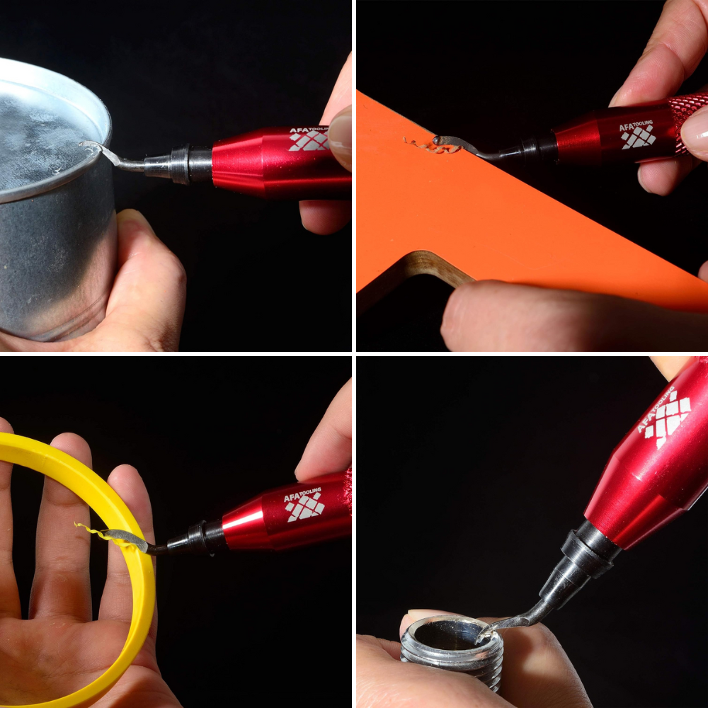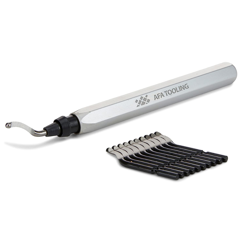 The AFA Tooling Deburring Tool is a simple and effective tool that works well on most metals, plastics, and 3D-printed objects. The blade set is made of tempered high-speed steel, which means it's stronger than regular steel. This makes the tool last longer while still being able to cut through materials with ease.