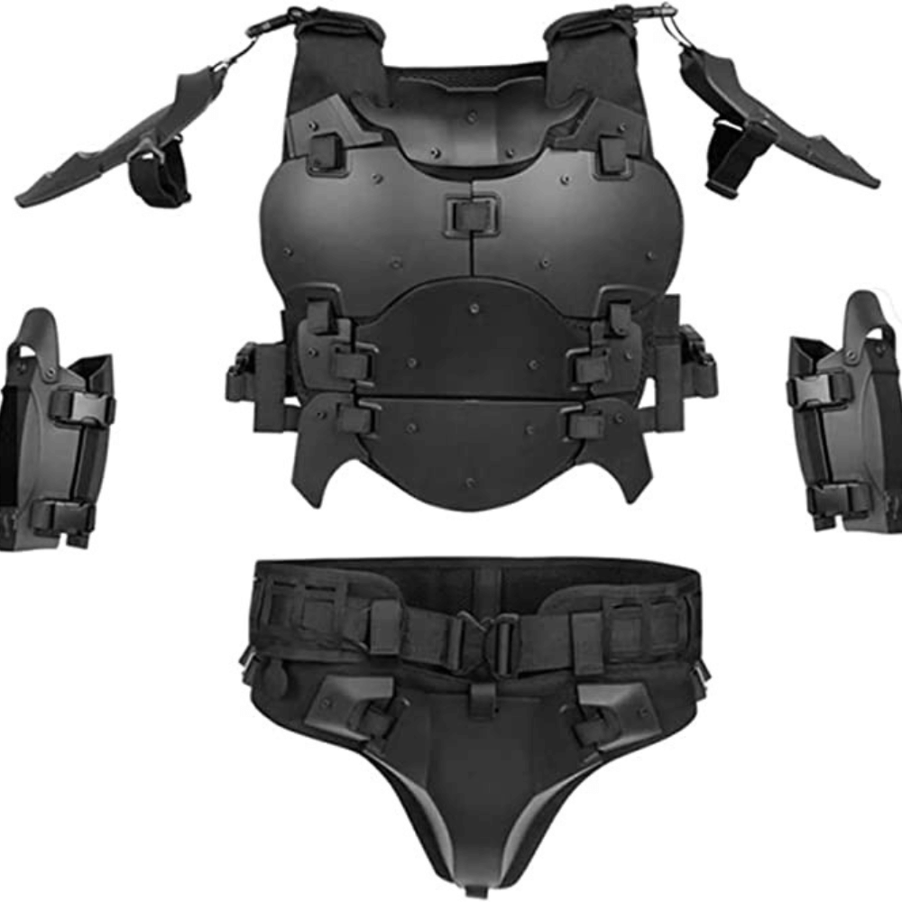 - [PERFECT BODY ARMOR VEST]:5 in 1 Airsoft Set(Airsoft Vest+Elbow+Shoulder Protrctor+Crotch Protector+Battle Belt ).This Tactical Chest Protector Set is Perfect for you, And Can be Inserted the Plate in the Back that Protect you From being Hurt in Games.