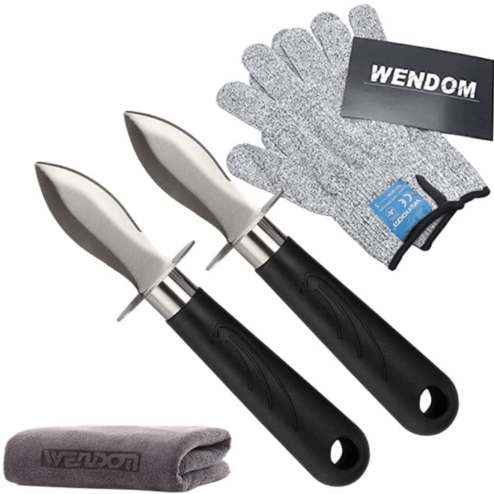 WENDOM Oyster Knife Shucker Set Oyster Shucking Knife and Gloves Cut Resistant Level 5 Protection Seafood Opener Kit Tools Gift(2knifes+1Glove+1Cloth)