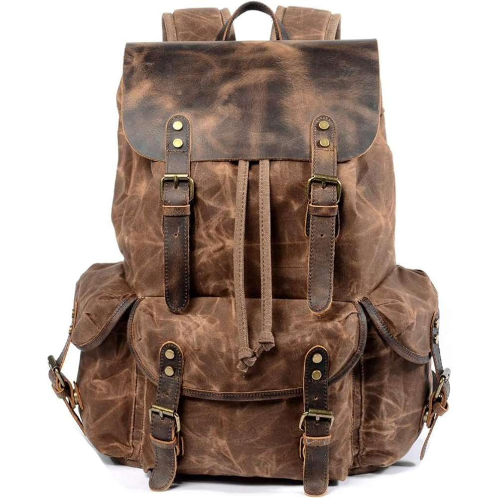 WUDON Leather Backpack for Men, Waxed Canvas Shoulder Rucksack Carry-On Travel Backpack