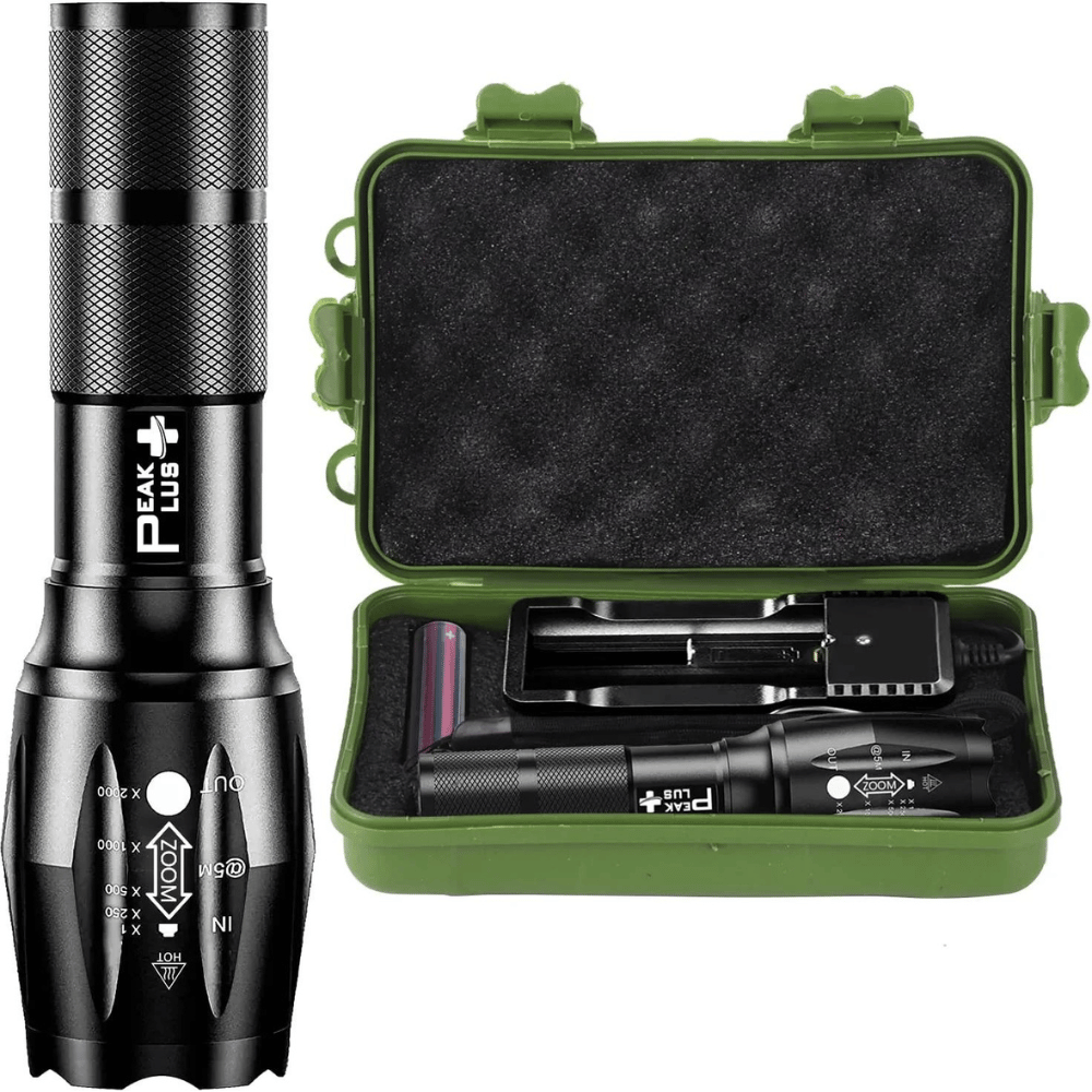 PeakPlus Rechargeable Tactical Flashlight LFX1000 (Rechargeable Battery and Charger Included) - High Lumens LED, Super Bright, Zoomable, 5 Modes, Water Resistant - Best Camping, Emergency Flashlights