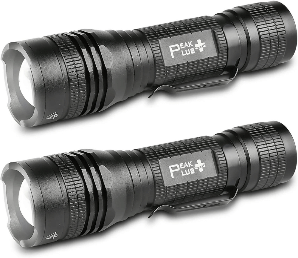 PeakPlus LED Tactical Flashlight PTAC1000 [2 Pack] - Single Mode, High Lumen, Zoomable, Water Resistant, Flash Light - Camping, Outdoor, Emergency, Everyday Flashlights with Clip