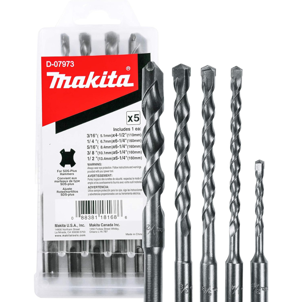 - MAKITA’S SDS+ Drill Bit Set with Case For 7/8" or Greater SDS-Plus Chuck Rotary Hammer Drills | This set has 5 Premium, Long-Lasting, Heavy-Duty, Tungsten Carbide Bits for EASY & Reliable drilling, screwing and fastening into 4" Deep Heavy-Duty Masonry, Reinforced Concrete, Tile, Brick & Cinder Block