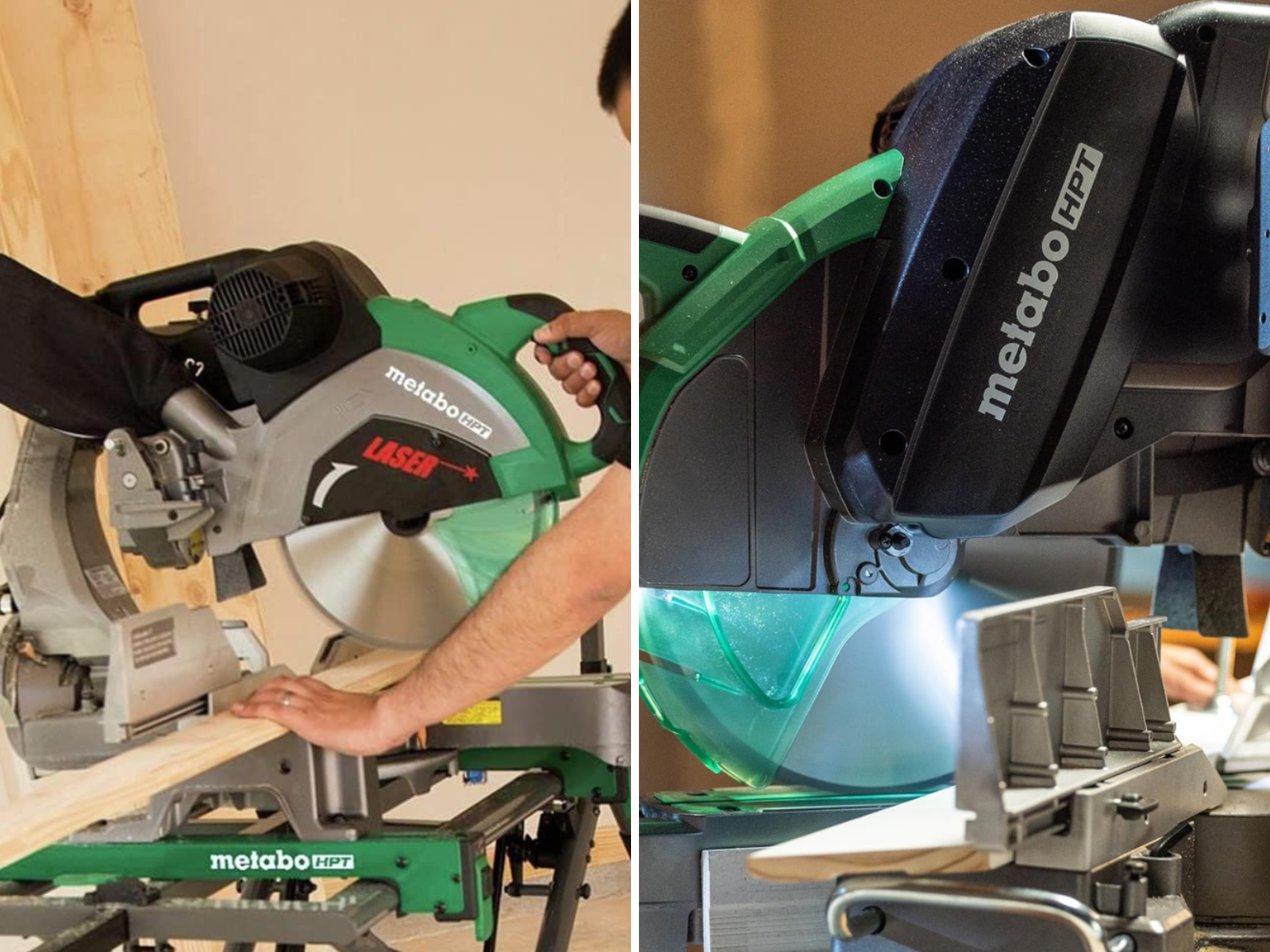 The Metabo HPT sliding compound miter saw has a powerful motor, a laser marker system for increased accuracy, and an ergonomic upfront bevel lock for easy adjustments. It also has positive stops and large scales for quick and precise measurements. Additionally, it is lightweight and comes with a 5-year warranty.