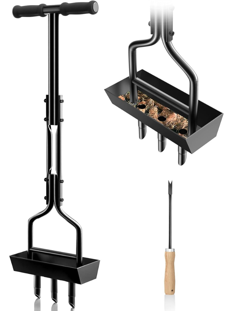 - Core Aerator: Uses hollow tines to pull out plugs of earth. Most recommended for best results, especially in compacted areas. Usually operated by hand with a foot bar for leverage.
