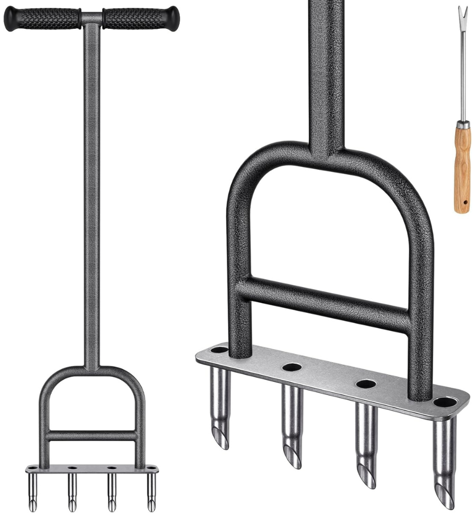 Lawn Coring Aerator, Stainless Steel 4 Corer Plug Aerator Tool with Soft Rubber Grip