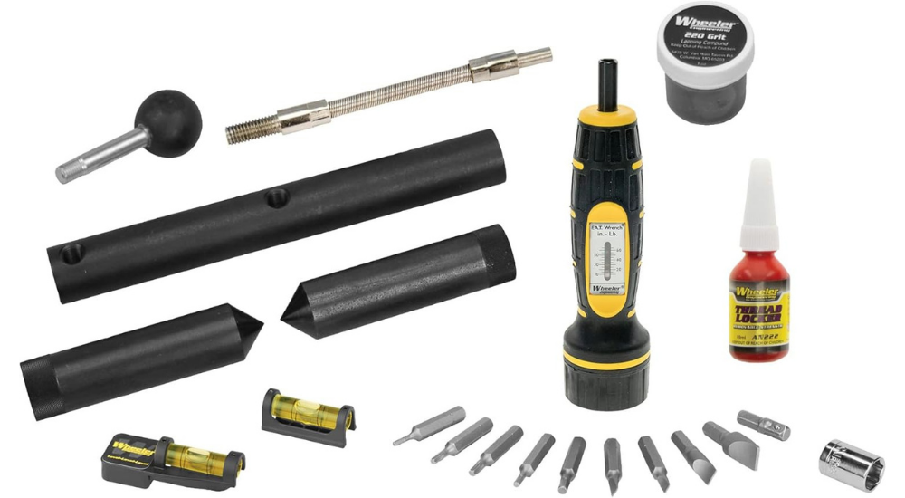 - INCLUDES: Wheeler Professional Reticle Leveling System, Laser Bore Sighter, Firearms Accurizing Torque Wrench, 9 bits, 1 socket, lens pen, thread locker, and storage case