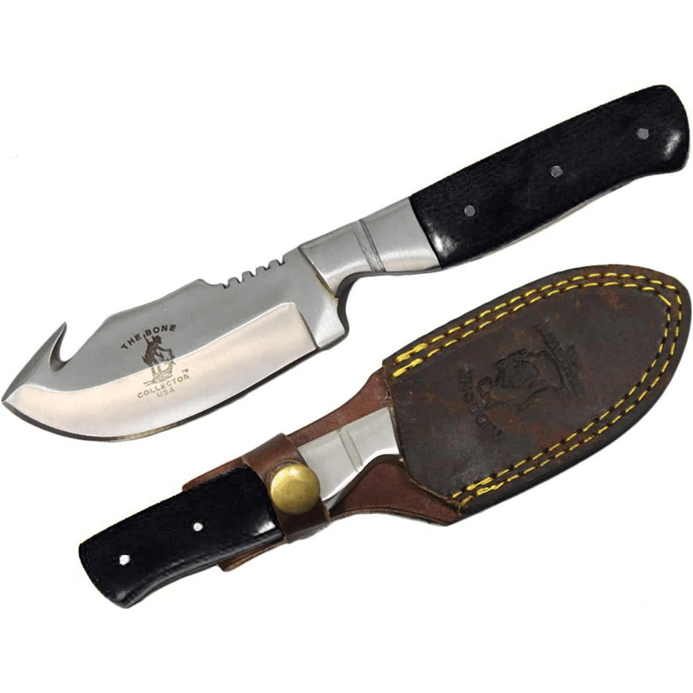 Bone Collector 7.5" Gut Hook Blade Black Bone Handle Hunting Knife with Leather Sheath